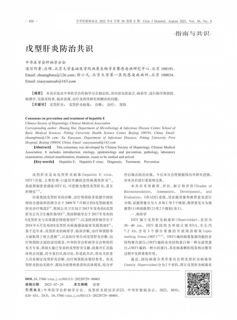 戊型肝炎病毒(Hepatitis E Virus,HEV)是全球范围内病毒性肝炎最主要的病原体之一。近年来,戊型肝炎报告发病率呈上升趋势,报告发病数已连续10年远超甲肝,死亡率连续15年超过甲肝,其中对孕妇和老年人以及慢性肝病患者人群的危害最为严重。戊肝已成为不可忽视的肝脏疾病。