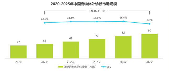 近几年,随着养宠群体日渐增长,宠物经济发展迅速,随之而来的,宠物诊断行业也大规模兴起。据统计,2022年中国宠物疾病诊疗市场规模预估为110亿元,未来将超180亿。其中宠物体外诊疗市场规模大约为61亿元,年复合增长率超20%,预计2025年达到90亿元规模。