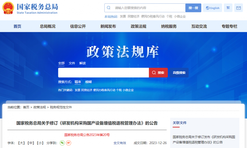 前不久,国家税务总局发布了关于修订《研发机构采购国产设备增值税退税管理办法》的公告(以下简称《办法》),并明确自2024年1月1日起实施。