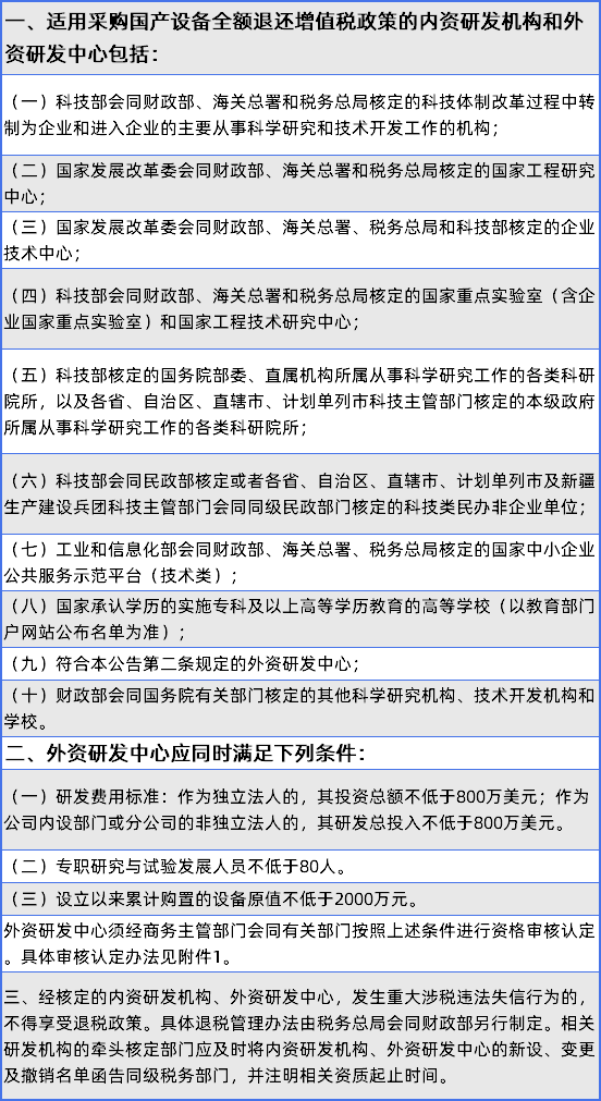 涉及全额退还增值税的相关设备清单,也在财政部、商务部、税务总局三部门去年8月印发的《关于研发机构采购设备增值税政策的公告》中做了详细公布。