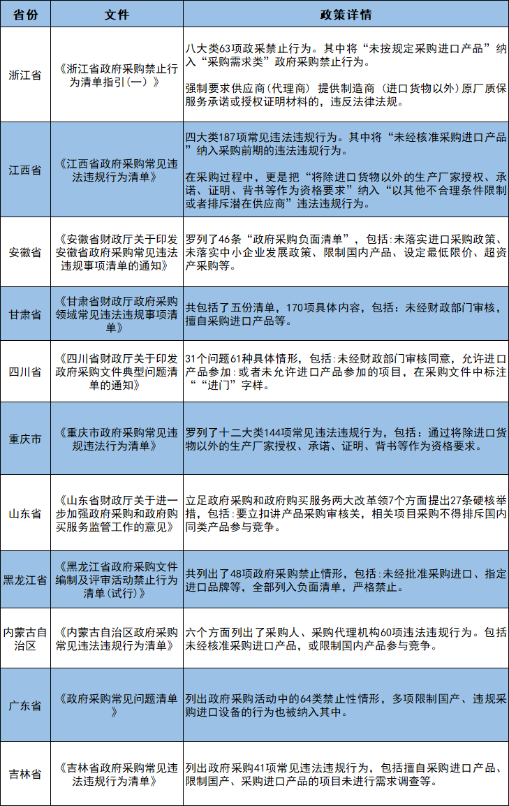 包括浙江、广东、黑龙江、吉林等多省接连发布通知,着重强调应当采购本国产品,把政府采购中限制国产设备、违规采购进口等行为,纳入负面清单严格禁止。