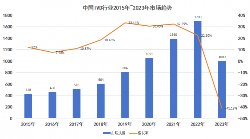 根据最新披露的数据,我国GDP在2023年仍维持了5.2%的增速,但同期我国IVD行业市场规模却出现了大幅下跌,下跌幅度达到了惊人的41%。