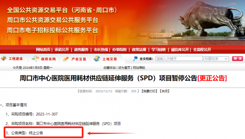 近日,周口市中心医院发布耗材SPD项目终止公告,该项目服务期3年,为医院提供医用耗材(包含高值、低值、体外诊断试剂)SPD服务。