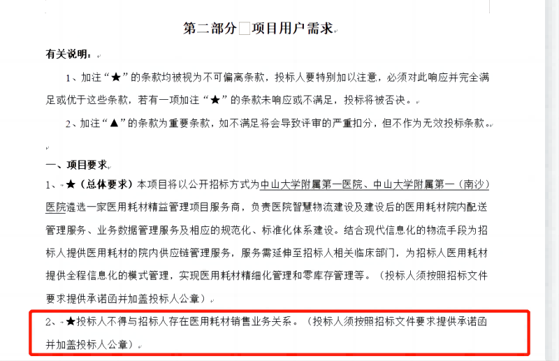因此,在西安市第一医院、中山大学附属第一医院等一些大型三甲医院SPD项目的招标公告中,就明确要求:投标人不得与招标人存在业务关系。