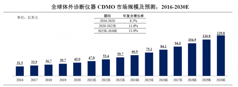 根据弗若斯特沙利文数据显示,全球体外诊断仪器CDMO市场在逐步扩大。预计2025-2030年市场将以11.6%的年复合增速继续扩张,到2030年将达到129.8亿美元。