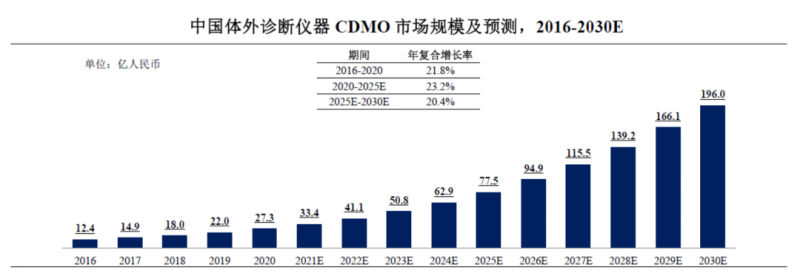 在此前高禾投资的分析中,也表示,受政策和需求拉动,预计未来十年中国体外诊断仪器、试剂及一次性塑料耗材第三方研发制造服务市场将快速发展,2025年至2030年将以19.3%的年复合增长率增长至424.0亿人民币。
