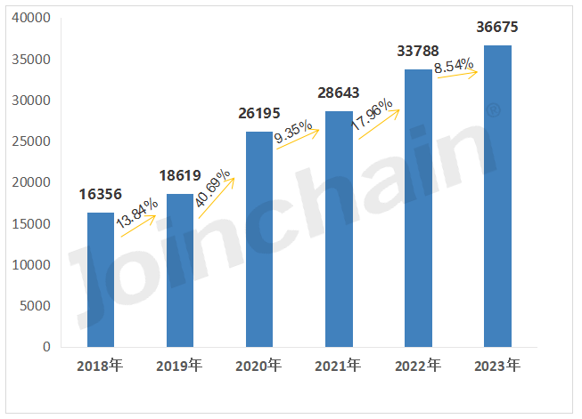 据众成数科(JOINCHAIN)统计,2018年至2023年全国医疗器械生产企业数量持续增长,截至2023年12月31日,全国医疗器械生产企业达36675家,较2022年底(33788家)增长8.54%。