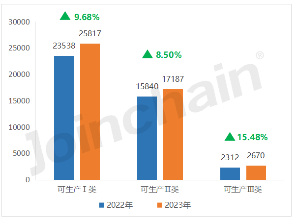 其中,可生产Ⅰ类产品的企业25817家,较2022年底增长9.68%。可生产Ⅱ类产品的企业17187家,可生产Ⅲ类产品的企业2670家,分别增长8.50%、15.48%。