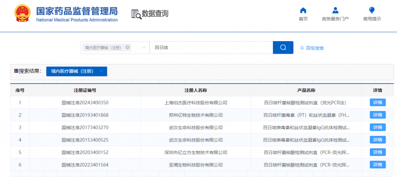 从国家药监局的官网上来看,目前与百日咳相关的检测产品共有6款,3款核酸试剂盒,2款胶体金试剂盒,1款ELSA试剂盒。