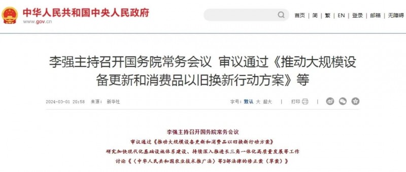 国务院总理李强3月1日主持召开国务院常务会议,审议通过《推动大规模设备更新和消费品以旧换新行动方案》,研究加快现代化基础设施体系建设、持续深入推进长三角一体化高质量发展等工作,讨论《〈中华人民共和国农业技术推广法〉等3部法律的修正案(草案)》。