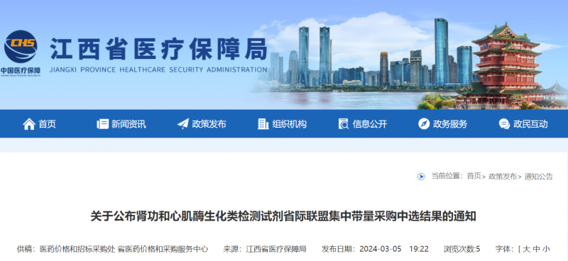 2023年12月21日,江西牵头开展的二十四省(区、兵团)肾功心肌酶生化类检测试剂省际联盟集中带量采购,在南昌召开信息公开大会,并产生拟中选结果。据统计,本次集采中选产品价格平均降幅约77%,年节约采购资金近40亿元。