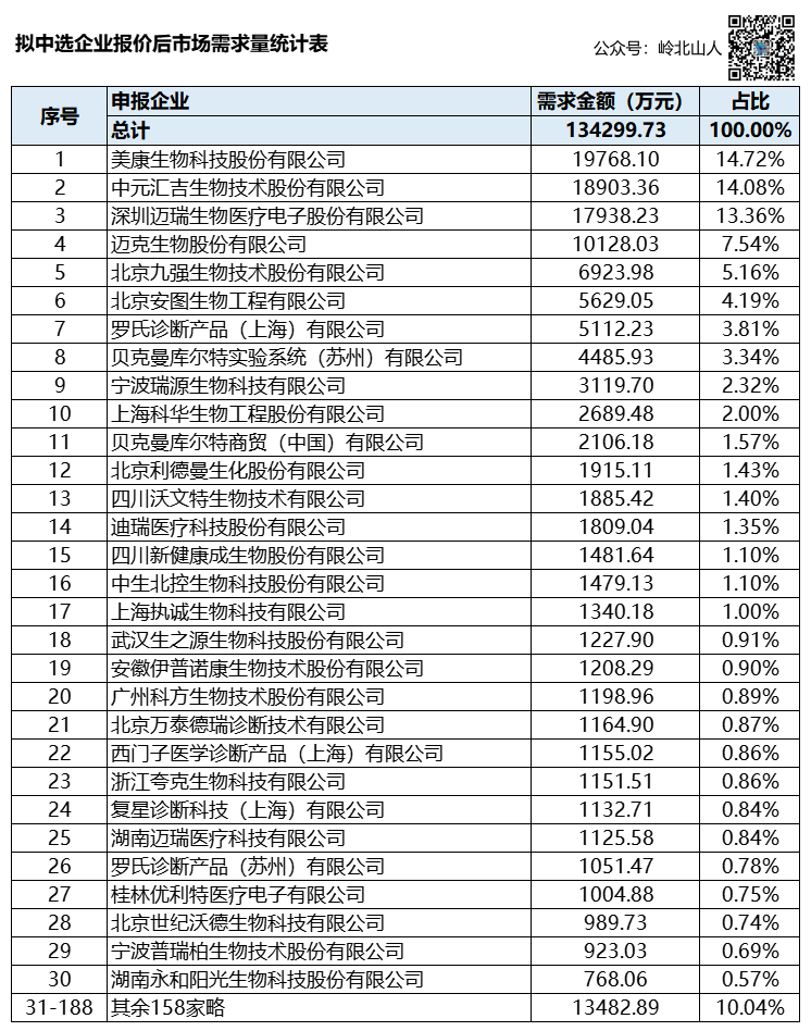 如果按各企业的中选价格,再乘以本企业的需求量,不考虑掉标企业的量以及分量,可以得出整体市场的容量。