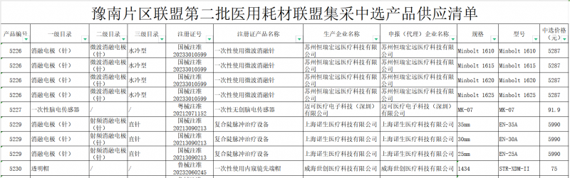 去年年底,漯河医保局发布《关于豫南片区联盟第二批医用耗材集中带量采购的公告(八)》,公布了透明帽、脑电传感器、消融电极(针)、乳头切开刀4类耗材的集采中选结果。