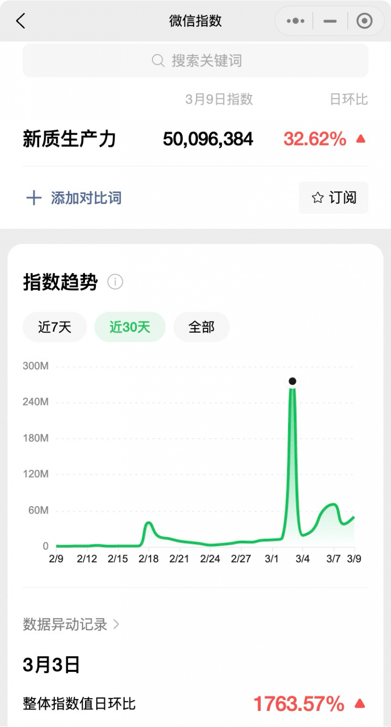 在今年的全国“两会”中,“加快发展新质生产力”成为了热议的焦点,亦成为代表委员们积极建言献策的核心议题。据微信指数显示,“新质生产力”的搜索指数在3月3日日环比暴增1763%。