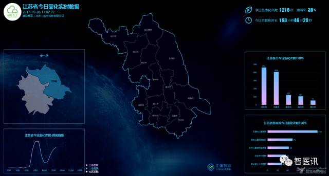 爱立信携手阿斯利康在江苏省成功部署了1000个智能雾化器,主要部署在医院、研究机构和家庭中,例如无锡市儿童医院等。在阿斯利康无锡创新中心,可以看到江苏省一天中整体的智能雾化统计数据,包含各地级市累计雾化次数、全省累计总雾化次数、全省总雾化时长等等。