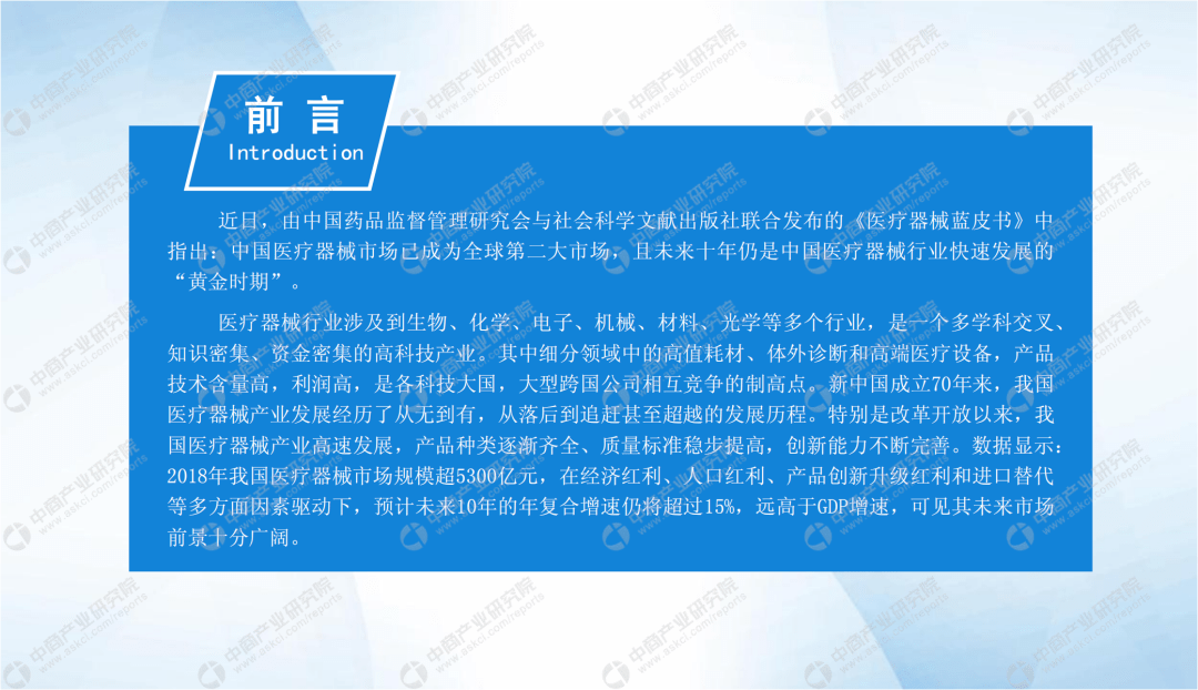 医疗器械行业涉及到生物、化学、电子、机械、材料、光学等多个行业,是一个多学科交叉、知识密集、资金密集的高科技产业。其中细分领域中的高值耗材、体外诊断和高端医疗设备,产品技术含量高,利润高,是各科技大国,大型跨国公司相互竞争的制高点。新中国成立70年来,我国医疗器械产业发展经历了从无到有,从落后到追赶甚至超越的发展历程。特别是改革开放以来,我国医疗器械产业高速发展,产品种类逐渐齐全、质量标准稳步提高,创新能力不断完善。数据显示:2018年我国医疗器械市场规模超5300亿元,在经济红利、人口红利、产品创新升级红利和进口替代等多方面因素驱动下,预计未来10年的年复合增速仍将超过15%,远高于GDP增速,可见其未来市场前景十分广阔。