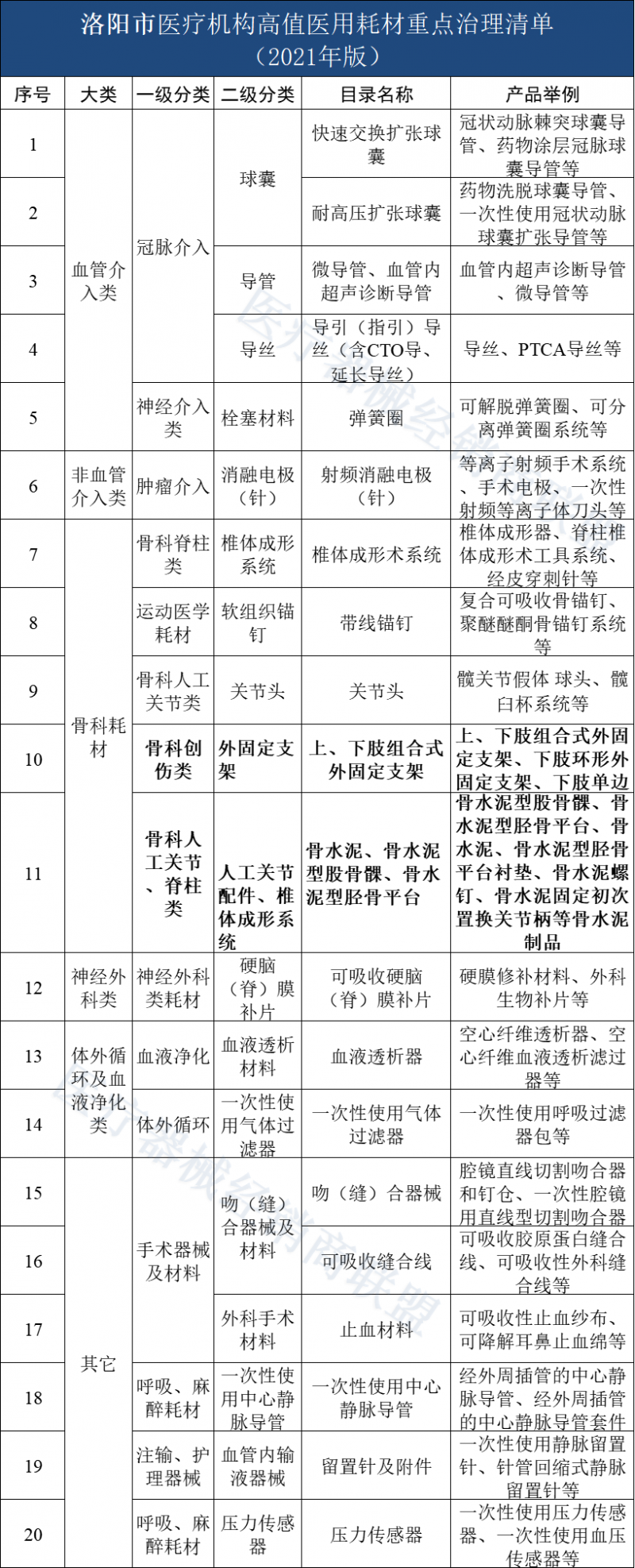 以河南省洛阳市为例。11月2日,洛阳市卫健委发布了《关于公布全市医疗机构高值医用耗材重点治理清单(2021年版)的通知》,其中共有20种高值耗材被列为洛阳市医疗机构重点治理对象,包括已经被纳入省际联盟集采范畴的药物涂层冠脉球囊导管等产品。
