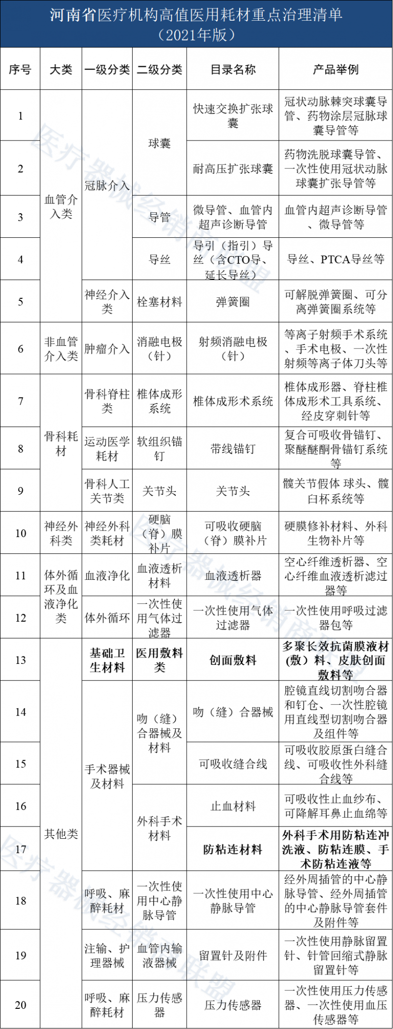 无独有偶,在河南省公布的《医疗机构高值医用耗材重点治理清单(2021年版)》中,除创面敷料、防粘连材料外,骨科创伤、人工关节、脊柱类耗材等国采耗材,也成为河南省医疗机构高值医用耗材重点治理对象。