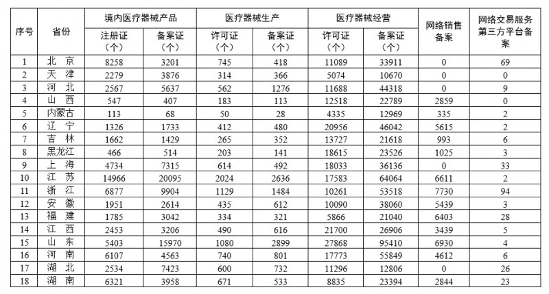 根据发布信息,境内医疗器械产品注册数前三的地区分别为江苏、广东、北京,分别达到14966个、13267个、8258个;医疗器械生产许可证数前三的地区分别为广东、江苏、浙江,分别达到2633个、2024个、1129个;医疗器械经营许可证数前三地区分别为山东、江西、广东,分别达到27868个、21700个、21365个。