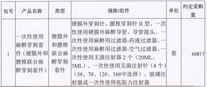 第一包:一次性使用麻醉穿刺套件(硬膜外和腰椎联合麻醉穿刺套件)