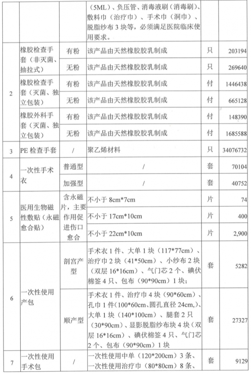 本次采购项目共7包,包括一次性麻醉穿刺套件(硬膜外和腰椎联合麻醉穿刺套件)、橡胶检查手套、PE检查手套、一次性手术衣、医用生物磁性敷贴(永磁愈合贴)、一次性使用产包、一次性使用手术包。