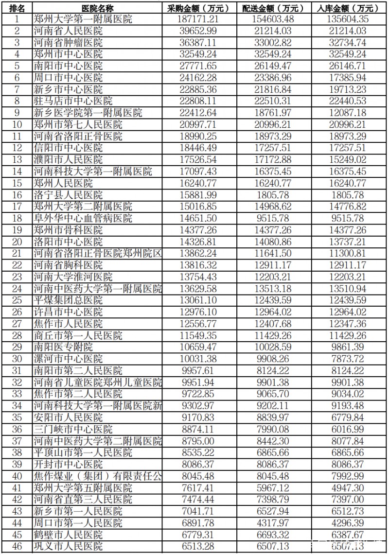 此外,河南省公共资源交易中心还发布了采购金额排名前100的医疗机构、供货金额排名前100的生产企业、配送金额排名前100的经营企业。